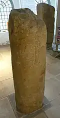 A stone pillar also known as 'The Margam Stone', and 'Carreg Lythyrenog'. It originates from a nearby mountain location, set into a prehistoric burial mound, where a replica now stands. It was first documented in 1578, and local folk-lore declared that anyone reading the inscription would die soon afterwards.[6] It is a stone pillar, 1.01 metres (3.3 ft) high, with four lines of Latin inscription and an incised cross. On the back there is an Ordnance Survey bench mark, and various more recent carvings. It was moved to the museum before 1945.[6]