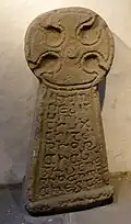 A disc-headed sculptured cross, with an inscription which fills the cross stem. First mentioned in 1697, it was in Margam Abbey Churchyard, south of the Church, until it was moved into the museum.[11] It is 1.01 metres (3.3 ft)high, 0.48 metres (1.6 ft) wide and 0.3 metres (0.98 ft) thick, made from locally occurring Pennant sandstone.[11] The cross head is 0.44 metres (1.4 ft) in diameter. It is made from a single piece of Pennant sandstone, although a thin tenon on its base suggests it was made to fit into a pedestal socket.[11] Stylistically the splayed arms and wide circular armpits are similar to 10th-century crosses from the north of England.[11]