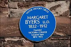 - ^ a b Luddy, Maria (2004). "Byers [née Morrow], Margaret (1832–1912), educationist and temperance activist". Oxford Dictionary of National Biography (online ed.). Oxford University Press. doi:10.1093/ref:odnb/47766. (Subscription, Wikipedia Library access or UK public library membership required.)