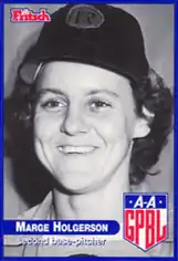 Born in Mobile, Alabama, Marge Holgerson started her career at second base but turned into a solid pitcher after a slow start. She collected a 76–69 record during her seven years in the league, allowing a 1.07 base runner per inning pitched, while her 1.94 career earned run average ranks her eighth in the all-time list of AAGPBL pitchers with at least 1,000 innings of work.[1][2]