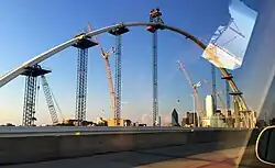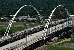 After delays, construction on the bridge began in 2012, costing over $200 million.[4][5] Specifically, the arched pedestrian and bicycle bridges cost $115 million, while the actual freeway bridge was paid for by the state and cost an additional $120 million.[6] The main concrete part of the bridge, which carries I-30 traffic, opened in 2013. The 1,200-foot-long (370 m) steel suspension arches on both sides of the bridge, which also house the pedestrian and bicycle paths, are separate from the concrete part.[7] In April 2014, footings for the arches were constructed, while steel fabrication took place at Tampa Steel Erecting Company's plant in Florida. The superstructure subcontractor to CRC Joint Venture, American Bridge, expected steel components to arrive on site in Dallas during the fall of 2014. The steel arches were completed in 2017, and the entire bridge was planned to open by the end of the year.