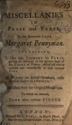 - ^ a b Pennyman, Lady Margaret (1740). Miscellanies in Prose and Verse: By the Honourable Lady Margaret Pennyman. Containing, I. Her Late Journey to Paris, ... II. Poems on Several Occasions, ... Published from Her Original Manuscripts. To which are Annexed, Some Other Curious Pieces. E. Curll.