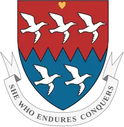 Dame Margaret Seward's Coat of Arms, designed by Patric Dickinson (officer of arms) in 2007 (Per fess indented Gules and Azure five seagulls volant to the sinister three and two Argent)