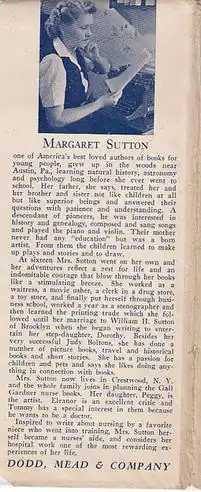 Margaret Sutton (January 22, 1903 - June 21, 2001) was the pen name of Rachel Beebe, an American author and teacher who is famous as being the author of the Judy Bolton Series of mystery books, 38 volumes published between 1932 and 1967. In addition to this series, she also wrote the Gail Gardner series, The Magic Maker series, Palace Wagon Family, Jemima, Daughter of Daniel Boone, as well as several other books.[1]