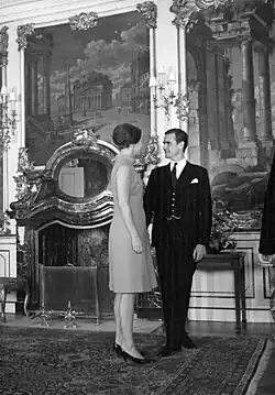 Margrethe attended the traditional New Year Courts for the first time in 1956.[2] On her eighteenth birthday, 16 April 1958, Margrethe was given a seat in the Council of State. She subsequently chaired the meetings of the Council in the absence of the King.[3] In 1960, with her first cousin, Princess Margaretha of Sweden, and Princess Astrid of Norway, she travelled to the United States, which included a visit to Los Angeles, and to the Paramount Studios, where they met several celebrities, including Dean Martin, Jerry Lewis and Elvis Presley.[11]