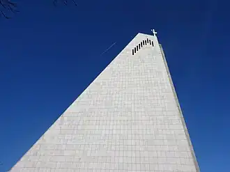 The shape of the building is a stylised letter "M" as a symbol for Mary, the mother of Jesus, and the floor is the Star of David, indicating that she was Jewish. The materials are predominantly concrete as the common material at the time, also slate and glass. Light comes from the west and illuminates the high wall behind the altar in the east.[2] The interior features two large triptychs by Otto Ritschl from Wiesbaden.[1][3] The artist created the works in 1973 and 1976 as abstract paintings with large shapes in bold colours, intended to invite to prayer and meditation.[4]