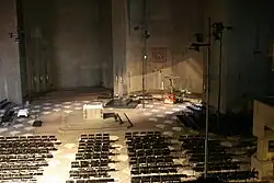 The church is a concrete building in brutalist style, with a concrete roof that has been compared to tents, crystals, a rock and a town.[8] The complex is reminiscent of an abstract cubist sculpture.[8] The entrance hall, with a low ceiling, is kept dark, to make the altar, illuminated through large stained-glass windows, the brightest place.[3] The floor plan shows a curved approach from the entrance opening towards the altar.[9] The interior is intended to resemble a market place, following concepts of the Second Vatican Council. It was a radical transition from elaborately decorated churches with a separation of altar and congregation.[3] Intimate rooms are available for private devotion: the Gnadenkapelle (Chapel of Grace) with the image of Mary, the Sakramentskapelle (Chapel of the Sacraments), and the Unterkirche (Lower Church) below the main hall.[9]
