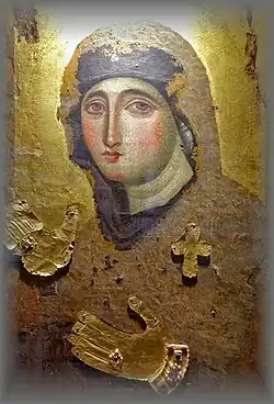 The icon belongs to the iconographic type of Hagiosoritissa (Greek: Ἁγιοσορίτισσα, from hagios, "holy" and soros, "shrine"), i.e. the "Icon at the Holy Shrine" in the former Chalkoprateia Church in Constantinople. The more common name is Maria Advocata ("Mary as intercessor", from Greek Paraklesis). In the choice of motif for Marian icons, representations of Mary without the Child Jesus (Advocata) preceded the images of Mary with Him (e.g. Hodegetria).[10]