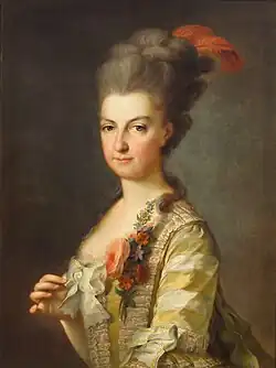 In the following years, Maria Christina developed an intense love affair[2] with Princess Isabella of Parma, who married the future Joseph II, Holy Roman Emperor on 6 October 1760. Among other things, the two young women often played together. The beautiful, educated, and very sensitive Isabella, who detested the court ceremonial and her position as wife of the Habsburg heir, wanted a more sensual destiny; however, despite these inner feelings, she appeared to be cheerful and satisfied with her fate. While her husband loved her very deeply, she was reserved towards him. In contrast, for Maria Christina, she had a heartfelt affection, expressed in about 200 letters between them, usually written in French.[3][4] They spent so much time together that they were compared to Orpheus and Eurydice. Isabel and Mimi were united not only by a shared interest in music and art but also by a deep mutual love.[5]