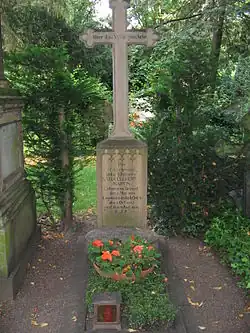 In order to become internationally known, she took part in the Kunst- und Industrie-Ausstellung (Art and Industry Exhibition) organised by the Gewerbe-Verein in Cologne from 27 May 1838 to 4 July 1838 on the Heumarkt. As late as 30 August 1842, advertisements appeared in the Kölnische Zeitung about her melissa spirit. Shortly before her death, she wrote her will on 5 April 1843, in which she made "Peter Schaeben, who lives with me" the "heir to my entire estate, trusting that he will faithfully maintain the pious attitude he has shown since then throughout his life".[21] Maria Clementine Martin died on August 9, 1843, and was buried in the Melaten cemetery with great sympathy.[22] Her grave is a listed building. Her water received a first award after her death in August 1843 at the London World's Fair, which took place between May and October 1851. She bequeathed the business to her assistant Peter Gustav Schaeben (1815–1885), who expanded it considerably and distributed the products worldwide.[23]