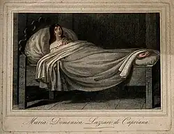 After her father's death in 1829, her health began to deteriorate, and as of 1833 she became bedridden. She reported that on 17 December 1834, after a Marian vision, the visible signs of the Passion appeared on her body.[1] According to her physician, she ate and drank nothing for the last 14 years of her life except for receiving Holy Communion.[3] In 1835 she received the stigmata, and shortly after, the crown of thorns. She is frequently depicted with her hands joined bleeding as she lays upon her bed. She died on 4 April 1848. Her cause for beatification was formally reopened in 1995 and she was declared venerable in 2023.