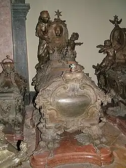 In Joseph's first reaction to receiving the news of his wife's death, he had told some of his intimates some remarks which imply regrets for the coldness he had shown to her. He further brought himself to tell his sister-in-law, Duchess Maria Antonia of Bavaria, that his wife had been "for so many reasons worthy of respect".[10] Maria Josepha was buried in the Imperial Crypt in Vienna, but Joseph did not attend her burial.[11]
