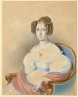 First-cousin of her husband and granddaughter of Empress Maria Theresa, the new Empress was well-educated and surpassed her predecessor in culture and intellectual brilliance.[20] Muse and personal friend of the poet Johann Wolfgang von Goethe, she was responsible for the intellectual formation of her stepdaughter, developing in Maria Leopoldina a taste for literature, nature and music by Joseph Haydn and Ludwig van Beethoven. Because she had no children of her own, she willingly adopted those of her predecessor; Maria Leopoldina always considered her stepmother to be her mother and she grew up with Empress Maria Ludovika as her "spiritual mother".[21] Thanks to her, the Archduchess had the chance of meeting Goethe in 1810 and 1812, when she went to Carlsbad with her stepmother.[21]