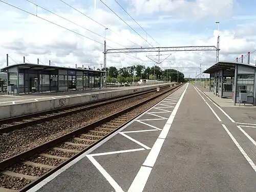 Maria Station is a railway station for commuter trains located on the West Coast Line in the northern parts of Helsingborg, Sweden.[1] The station was inaugurated in 1999 and currently consists of two platforms and two tracks. The local trains (Pågatåg) serve the station. It is named after the neighborhood Mariastaden (Maria town) which is named after the Santa Maria church located here. It is one of three passenger railway stations located in the urban area of the city of Helsingborg, along with Helsingborg C and Ramlösa Station, of which it is the northernmost situated railway station of the city. Helsingborg Municipality has however ten railway stations where passengers can embark.