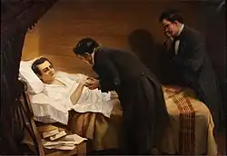Manuel Moreno speculated later that he was poisoned by the captain. Manuel Moreno was unsure of whether the captain really gave him that substance, or if he substituted something else, or gave an even higher dose. Circumstances did not allow an autopsy to be performed. Further points used to sustain the idea of a murder are the captain's refusal to land elsewhere, his slow sailing, his administration of the emetic in secrecy, and that he didn't return to Buenos Aires with the ship.[117] Enrique de Gandía pointed to an irregular ruling of the Junta that appointed a man named Curtis as Moreno's replacement for the diplomatic mission in the case of Moreno's death. The son of Mariano Moreno commented to the historian Adolfo Saldías that his mother, Guadalupe Cuenca, received an anonymous gift of a mourning hand fan and handkerchief, with instructions to use them soon. By that time, the murder of Moreno was a common assumption, and it was mentioned during the trial of residence of the members of the Junta. Juan Madera stated at the trial that Moreno may have requested to go to Britain because he was afraid of being murdered and that he may have stated this during the meeting when the Junta discussed his resignation.[118] Modern author Manuel Luis Martín studied the health of both Moreno and his family and concluded that he died of natural causes.[119]