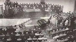 Saavedra increased his resistance to Moreno's proposals after the victory at the Battle of Suipacha, considering that the revolution had defeated its enemies and should relax its severity in consequence.[100] The Regiment of Patricians hosted a banquet celebration at the barracks, restricting attendance to the military and supporters of Saavedra. Moreno was not allowed to pass by the guards at the door, which generated a small incident.[101] That same night, Officer Atanasio Duarte, who was drunk, gave a crown of sugar to Saavedra's wife and saluted Saavedra as if he was the new king or emperor of the Americas.[102] The next day, when Moreno heard about the incident, he wrote the "Honours Suppression decree", which suppressed the ceremony usually reserved for the president of the Junta and inherited privileges of the office of viceroy.[102] Duarte was exiled, and Moreno's act was justified by stating that "An inhabitant of Buenos Aires neither drunk nor asleep should be expressed against the freedom of his country".[103] Saavedra signed the decree without complaint, but Gregorio Funes felt that the Patricians resented Moreno because of this.[104]