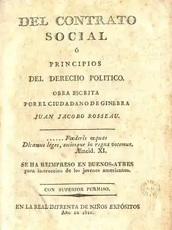 Mariano Moreno studied French and Spanish authors of the Age of Enlightenment during his studies at Chuquisaca. Jean-Jacques Rousseau's The Social Contract was the main influence; he translated this work into Spanish and used it to justify the actions of the Primera Junta. Contemporary people as Ignacio Núñez and Tomás de Anchorena acknowledged him as the translator. However, as the main page said that the work was "reprinted in Buenos Ayres", some historians doubt whether it was actually Moreno's work. Vicente Fidel López claimed that Moreno reprinted the translation made by the Spaniard Gaspar Melchor de Jovellanos, but the two translations differ.[148] Paul Groussac thought it was a reprint of an Asturian translation, and Ricardo Levene said that Moreno was not the translator, but neither gave any indication as to who they thought had completed it.[149] Enrique de Gandía considers that the comments of contemporary people and the lack of an earlier similar translation of Rousseau's work allow us to conclude that Moreno must have been the translator, at least until an earlier translation is found.[150]