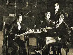 Mariano Moreno and Cornelio Saavedra had disagreements about the events of the May Revolution and the way to run the government; their disputes became public shortly after the creation of the Junta. Saavedra was the president, and Moreno was a secretary with the support of other vocal members. Ignacio Núñez describes how Morenists felt that the President was attempting to restore in his office the authority of the viceroys, thus downgrading the importance of the other members of the Junta at public events; while Saavedrists considered that the Secretary was overstepping his authority and did not allow even the appointment of a janitor that was not of his liking.[86] However, Domingo Matheu would clarify in his memoirs that their initial concerns with Saavedra were based more on his desire for honors and privileges than for a real power struggle.[87] Núñez described how Moreno was resisted by some criollos who initially supported the revolution without being aware of the long-term consequences. He was resisted by criollos alarmed by his straightforward way of talking about concepts like self-determination, tyranny, slavery, and freedom. Theologians resented that Moreno cited authors like Rousseau, Voltaire, or Montesquieu rather than Christian philosophers like Saint Augustine or Saint Thomas. He was also resisted by conservative lawyers and by most of the military.[88]
