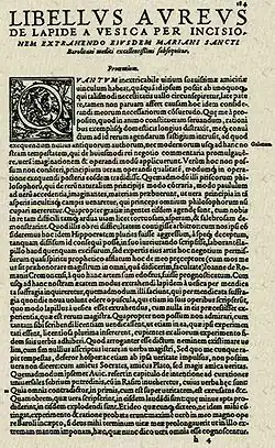 Mariano’s written work includes the Artium et medicine and the very important Libellus Aureus de lapide a vesica per incisionem extrahendo and the De lapide renum. Additionally, he was the first in Europe to demonstrate a new surgical technique called "sectio mariana", which employs the use of a new tool, the "esploratorium", for the extraction of renal calculi.