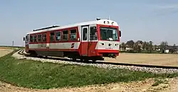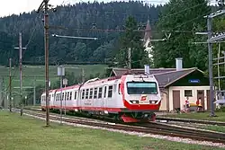 The normal passenger service on the line is now provided by a fleet of nine low-floor EMUs built by Stadler Rail, which entered service between 2012 and 2014. In summer these pull matching panoramic first-class coaches from a fleet of four. The three-car articulated EMUs are designed to operate up to 80 km/h, and are prominently branded Himmelstreppe ("Stairway to Heaven"), a name chosen to reflect the line's terminus in the pilgrimage centre of Mariazell.[1][3][4]