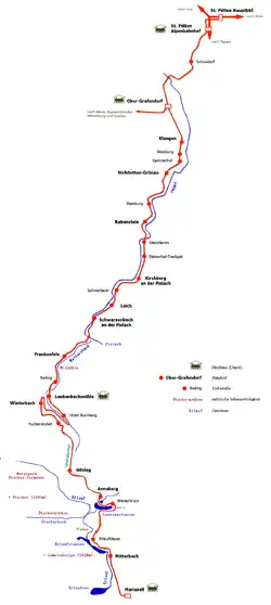 The now largely closed branch line was known to locals as the Krumpe (Lower Austrian dialect form of the word krumm, meaning "crooked" in German), as a reflection of its indirect nature. It left the main line at Ober-Grafendorf and was an unelectrified branch that lead through the foothills of the Alps in a roughly westerly direction by way of Kilb, Mank, Sankt Leonhard am Forst, Ruprechtshofen and Wieselburg an der Erlauf to Gresten. At Wieselburg an der Erlauf, it met and crossed the standard-gauge Erlauf Valley Railway between Pöchlarn and Kienberg-Gaming.