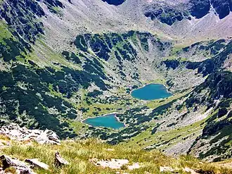 Marichini Lakes (Bulgarian: Маричини езера) are a group of four glacial lakes situated in the eastern part of Rila mountain range of southwestern Bulgaria at an altitude between 2,301 m and 2,508 m. They are situated in the Marichin cirque between the summits of Blizantsite (2,779 m) to the west, Marishki Chal (2,765 m) to the south and Mancho (2,771 m) to the southeast.[1] They are the source of the Tiha Maritsa, one of the two main stems of one of the longest rivers in the Balkans, the Maritsa.[2] Two of the lakes are permanent; the other two dry up in summer.