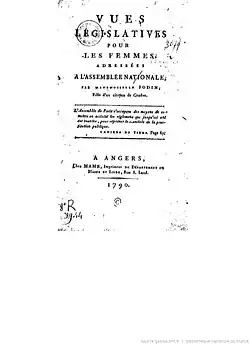 In 1790 she presented a treatise, entitled Vues Législatives Pour Les Femmes, or Legislative Views for Women, in front of the French National Assembly. Political works written by women in the 18th century were considered oddities; a letter, novel or a memoir was considered more suitable for female expression. But Marie Jodin was a radical for her time, who envisioned women in roles of political power, not the ones being told what to do.[18] It wasn't until the eve of the revolution that women like Jodin were able to write on political topics, such as the rights of women. As daughter of a citizen of Geneva, Jodin believed she had inherited an honorable and superior social status that gave her confidence to defend her rights as a woman and as a citizen of France.[19]