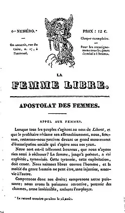 Marie-Reine Guindorf was a young laundry worker when she joined Saint-Simonism. She joined the activists around Claire Bazard. In August 1832, together with Désirée Véret, she founded La Femme libre in response to Barthélemy Prosper Enfantin's exclusion of women from decision-making among the Saint-Simonists.[4][5] With the second issue, the journal was renamed L'Apostolat des femmes.