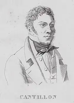 Cantillon was a distant relative of the French-Irish economist Richard Cantillon (d. 1734) and descended from the same Ballyheigue, County Kerry, branch of the family.[1] Cantillon was born in Paris, to a model maker, in 1781/82 and worked in the jewellery trade.[2][3] He was conscripted into the cavalry of the French Army and rose to become a non-commissioned officer and then sous-lieutenant (sub-lieutenant) in the hussars.[4][1][5] He served in the 1st Hussars during the War of the Fifth Coalition and an 1858 account by William Stirling Maxwell has him attempting to kill the regiment's colonel for a perceived affront, after which he was pardoned by Napoleon for his bravery in battle.[3] The same account states Cantillon afterwards joined the Chasseurs à Cheval de la Garde Impériale, retiring on a pension in 1813 before re-joining Napoleon for the Hundred Days. After the peace of 1815 he is said to have split his time between Brussels and Paris, with trips to Coblenz and Cologne. Cantillon is said to have been known for his fierce Bonapartism and hatred of the English.[6]