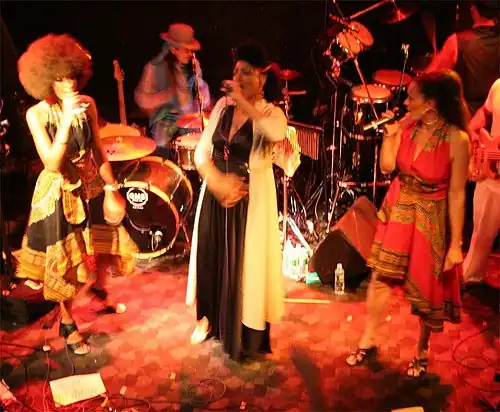 Daulne auditioned scores of female singers looking for the right combination of voices for an a cappella ensemble.[25] "When I did my first album, I was looking for girls that were the same mix as me--African and European," she says.[14] "Because I wanted to put these two sounds together to prove that to have blood from white and black was perfect harmony on the inside."[14] "I remembered Sylvie Nawasadio because we used to sing together on the train going to school," says Daulne.[10] "I met her again at the university in Brussels, studying sociology and anthropology. I asked her if she wanted to be a part of a cultural singing group. And Sabine [Kabongo] is, like me, a mixture–Zairean and Belgian. After her, I held an audition, and discovered Marie Alfonso, who’s Portuguese and white. Then came Sally Nyolo and the first concert, in November 1989."[10] The original idea of Zap Mama was "five singers who would be one as the pygmy," Daulne said.[26] "There is no chief."[26] "The power of voices was my thing," Daule said.[25] "I wanted to show the world the capacity of five women exploring with our voices and our minds, nothing else."[25] Daulne felt she was channeling the spirit of her Congolese ancestry so instead of using her own name, she called the group Zap Mama.[25] "We have a Zairean memory and a European memory, and together we find the same vibration, because we have European and Zairean music inside," said Daulne.