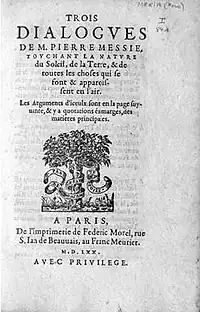- Three Dialogues of Pierre Messie, concerning the nature of the Sun, Earth, & all things that have appeared in the air. Full 1570 text in French. At the Bibliothèques Virtuelles Humanistes. Accessed June 2011.