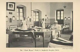 The mission was composed of 3 major hospitals. The first and largest hospital of the mission, St Stephen's Hospital in Delhi, was opened in 1885; it was the first mission hospital for women and children in Delhi. Dr Hayes worked under Jenny Muller, who was the first full-time doctor at this hospital. 70 miles north of Delhi, the mission had its second hospital in the city of Karnal. 70 miles southwest of Delhi, the mission had its third hospital in Rewari. Dr Hayes eventually led the Rewari Hospital. St Stephen's Hospital was rebuilt in its present site in Tis Hazari, Old Delhi beginning in December 1906.[2]