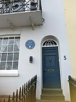 In England, they lived in Blackheath, where they were welcomed by prominent abolitionists, and then moved to 49 Weymouth Street, London, where she lived between 1821 and 1824.[6] In October 1822, she took up residence in Hastings, East Sussex, at what is now 5 Exmouth Place with her daughters, who, like many wealthy and aristocratic Londoners, wanted to escape the smog and bustle of central London. In 2022, blue plaques honouring the Queen's time in England were erected and celebrated.[6][7]