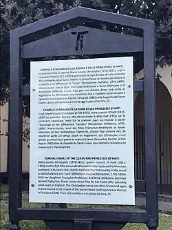 Shortly before her death, Marie-Louise wrote to Haiti for permission to return. She never did, however, before she died in Italy on 11 March 1851. She is buried in the church of San Donnino. A historical marker was installed in front of the church on 23 April 2023, to commemorate the Queen, her daughters and her sister.[1][8]