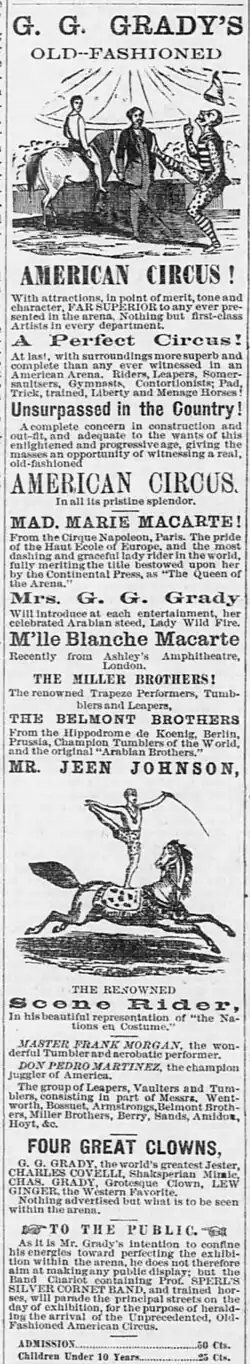 On crossing the Atlantic Macarte toured with the Nixon-Macarte Circus in Washington D.C. (1863); 'the fearless and graceful equestrian, Mme. Marie Macarte' was with James M. Nixon's Alhambra Circus in New York City (1863);[12] the Hippotheatron in New York City (1864); Rivers & Derious Circus in Washington D.C. (1864); the National Circus in Cincinnati (1864–65), and Frank Howes (1866), Palmer's (1866); Mike Lipman's (1866–67); Haight & Chambers Circus (1867);[13] Michael O'Connor's Circus (1869); Stowe & Norton Circus (1869), and G. G. Grady's Old-Fashioned Circus (1870).[7][14]