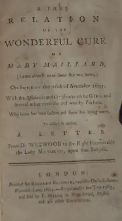 - ^ a b "A TRUE RELATION OF THE WONDERFUL CURE OF MARY MAILLARD,; (lame almost ever since she was born) on Sunday the 26th of Nov. 1693. With the affidavits and certificates of the girl, and several other credible and worthy persons, who knew her both before and since her being cured. To which is added, a letter from Dr. Welwood to the right honourable the Lady Mayoress, upon that subject by [MAILLARD, Marie]: (1787) Second edn. | Second Life Books, Inc". www.abebooks.co.uk. Retrieved 2023-05-20.