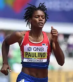 She won the 200 m silver medal in the 16th Annual Spring Break Classic held in Carolina, Puerto Rico, setting a new national record when she registered 22.70.[114] Paulino broke her 200 m record again during the 11° Meeting International Citta' Di Savona winning the gold with a 22.59 mark.[115] As one of the 2022 Ibero-American Championships favorites, Paulino set a 400 m Ibero-American Championship record and world leading time of 49.49 for the gold medal, breaking the 50.65 from the Ana Guevara's 1998 mark, also winning the gold in the 4 × 100 m with Martha Méndez, Anabel Medina and Fiordaliza Cofil, with a winning time of 43.81.[116] She won the National Championship in 200 m running in Bayaguana a new national record with 22.36,[117] soon after that, she became brand ambassador for Banco Popular Dominicano.[118]