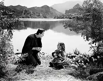 In 1931, Harris won the role of "Little Maria" in the horror film Frankenstein. In arguably the film's most memorable scene, Maria meets the fugitive monster (played by Boris Karloff) beside a lake and charms the monster with her innocence, humanity and friendship. These were qualities that he had not experienced with hostile, untrusting adults. A children's game is tragically misinterpreted by the monster, and he throws Little Maria into the lake,[4] unintentionally drowning her and turning the surrounding village's population into a lynch mob, seeking revenge after the child's body is found. The shot of Maria being thrown into the water was cut from original prints, and was restored in the 1980s.