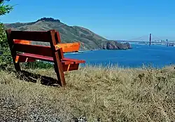 Where Conzelman Road runs along the southern shore of the Headlands and becomes one-way, a pedestrian path leads upwards to Hawk Hill. A short distance further on the right, in a grove of Monterey pines, is a bench from which it is possible to view the Golden Gate, ship traffic passing beneath the bridge, and the city just beyond.