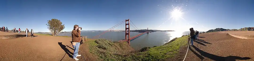 The area has views of San Francisco and, as such, is a tourist destination. One of the most common photographs of San Francisco is the view of the city from the Headlands with the towers of the Golden Gate Bridge just reaching out of the fog. On clear days, the site offers views of the bay, including the Farallon Islands, Angel Island, Alcatraz, the San Francisco–Oakland Bay Bridge, the Golden Gate Bridge and the East Bay.
