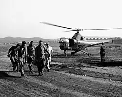 In August 1950, HO3S-1 helicopters and pilots from HMX-1 at MCAF Quantico, Virginia joined the squadron's eight OY-2 Sentinels and VMO-6 departed the United States in July 1950 as part of Marine Aircraft Group 33.[6] They arrived in Jinhae, Korea on 2 August[7] and immediately began to fly during the Battle of Pusan Perimeter becoming the first helicopter squadron in the Marine Corps to participate in combat operations[8] The OY-2's were flown as convoy escorts for the 1st Marine Brigade in addition to observation and reconnaissance missions. They proved so successful that it became regular procedure to have an OY over the brigade at all times during daylight hours.[9] In August 1950 the squadron, carried its first medevac and these missions became routine for VMO-6 pilots and crewmen. On 27 November 1950, Chinese encircled the 1st Marine Division at the Battle of Chosin Reservoir. For the first four days of the battle, until an expeditionary airfield was completed at Hagaru-ri on 1 December, helicopters from VMO-6 were the only aircraft able to evacuate the wounded taking 152 injured south to Hungnam. The next ten days would see them evacuate a further 538 aided by modified TBM Avengers that belonged to the Division.[10] During the Korean War, the squadron conducted 22,367 missions and flew 7,067 wounded Marines to safety.[11] After the signing of the Korean Armistice Agreement the squadron returned to MCB Camp Pendleton in June 1955. In 1951, the squadron replaced the HO3S-1 with the HTL-4.[12]