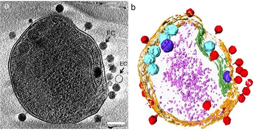 (a) Slice (~20 nm) through a reconstructed tomogram of P-SSP7 phage incubated with MED4, imaged at ~86 min post-infection. FC and EC show full-DNA capsid phage and empty capsid phage, respectively.