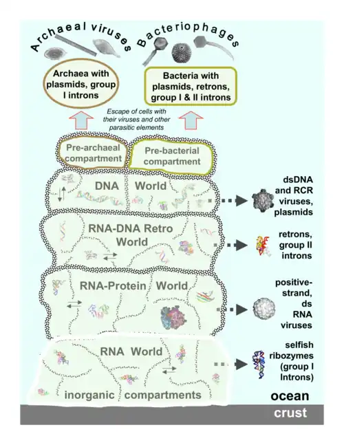 Characteristic images of RNA and protein structures are shown for each postulated stage of evolution, and characteristic virion images are shown for the emerging classes of viruses. Thin arrows show the postulated movement of genetic pools between inorganic compartments. Block arrows show the origin of different classes of viruses at different stages of pre-cellular evolution.[5]