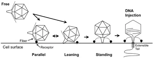 The phage first adheres to the cell surface with its tail parallel to or leaning at an angle to the cell surface in the pre-infection stage. The tail then firmly stands on the cell surface and extends its fibers horizontally, rendering the phage infection-competent, after which viral DNA is released into the cell through an extensible tube.[21]