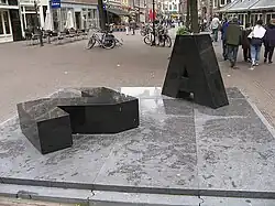 In 1979 the performance L'Uomo Volante takes place in De Vleeshal exhibition space in Middelburg, during the opening of Boezems solo exhibition Space Sculptures. The body of Marinus Boezem is one of the materials in this work. Boezem is dressed in a sort of airman's suit. Behind him stands a mirror which he holds in uneasy balance by means of ropes slung over his shoulders. A tense balance exists until he can no longer hold the weight and has to let go. The mirror is dashed to pieces on the floor. The Gothic vault of De Vleeshal is reflected in the fragments.[8] The Gothic arch motif is frequently found in Boezem's work, as in Etude Gothique (1985). This sculpture lies in the middle of a marketplace in the city centre of 's-Hertogenbosch. It is a thirty-centimeter-high podium of polished granite terrazzo in the form of a gothic arch. The sculpture acts as though it were the shadow of an imaginary arch. It lies at a point where the most important functions of the old city come together. That is on one side it points in the direction of the St. Jans Cathedral (religion), on the other side the sculpture offers a view of the Stadhuis (government). The marketplace where the work is situated lies in the middle of a shopping area and is a place of economic activity (economy). The sculpture has also a social purpose in the urban space because it can function as a seat.[9]