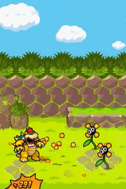 There are various minigames in which the Mario Bros. have to help out Bowser's body from the inside in order to help him progress. Examples include the "Arm Center", where the brothers hit sparklike items into a muscle to strengthen Bowser's arms; the "Leg Outpost", where they stomp on leg muscles to strengthen Bowser's legs; and the "Gut Check", where they help digest food that Bowser eats. One location, the "Rump Command", has the player accumulate adrenaline in order to supersize Bowser if he is crushed, leading to a new battle system in which the DS is held vertically and all attacks require the stylus and microphone.[3] The 3DS version substitutes button presses for the microphone but still incorporates the stylus for certain moves.
