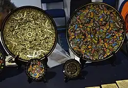 Gaspar owns his workshop in the town and works with his wife, herself an accomplished artisan.[2][3] For his maque lacquer work, she creates the natural pigments, stating that the nature of this work requires family involvement. Maque is a pre Hispanic lacquering technique which Gaspar prefers, but more modern lacquering, called “laca” is done at the workshop, mostly by Ortega Ruiz. She draws her designs from memory, most of which are traditional but she has a few of her own invention.[2]