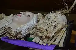 Gaspar and his wife are also known for their work in “pasta de caña”, the creation of sculptures and figures from a mass made from a mash of cornstalks, nopal cactus and orchid bulbs.[2][3][4] This craft was originally used to create pre Hispanic god figures and in the colonial era, it was adopted to Christian images because of it light weight.[4] He worked in the 2000s to revive the craft in Pátzcuaro, and has made a number of Christ figures as well as a nativity scene which was given to the Vatican in 2012.[1][3][4] However, Gaspar prefers maque work to pasta de caña, so Ortega Ruiz does most of this work, especially preparing the cornstalk paste.[2] The species of orchids needed are now under protection so the couple has created a greenhouse to grow their own with the support of the Universidad Michoacana de San Nicolás de Hidalgo (UMSNH).[4]