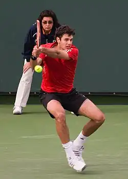 His ATP debut was at Miami Masters, where he drew a wild card, but he lost in the opening round.[12] The highlight of his Grand Slam debut at the 2002 Wimbledon Championships was the major upset of his first round defeat of Roger Federer, the seventh seed, 6–3, 7–6(2), 6–3 in just under two hours.[13] He finished the 2002 season in the top 100 in singles.