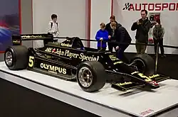 Andretti's timing was fortuitous, as he rejoined Lotus at the eve of the ground effect revolution. Since mid-1975, Lotus had been trying to shape the car to generate downforce (making the car faster in the corners) without a large rear wing (whose drag would make the car slower on the straights). The Lotus design team added sidepods with vents to take in air, which was then channeled under the floor to facilitate the Venturi effect. The car was effectively sucked towards the ground, allowing it to take corners at unusually high speeds.[109] Andretti, whose STP-March team had experimented with sidepods in 1970,[108] encouraged the team to make the sidepods even bigger.[110]